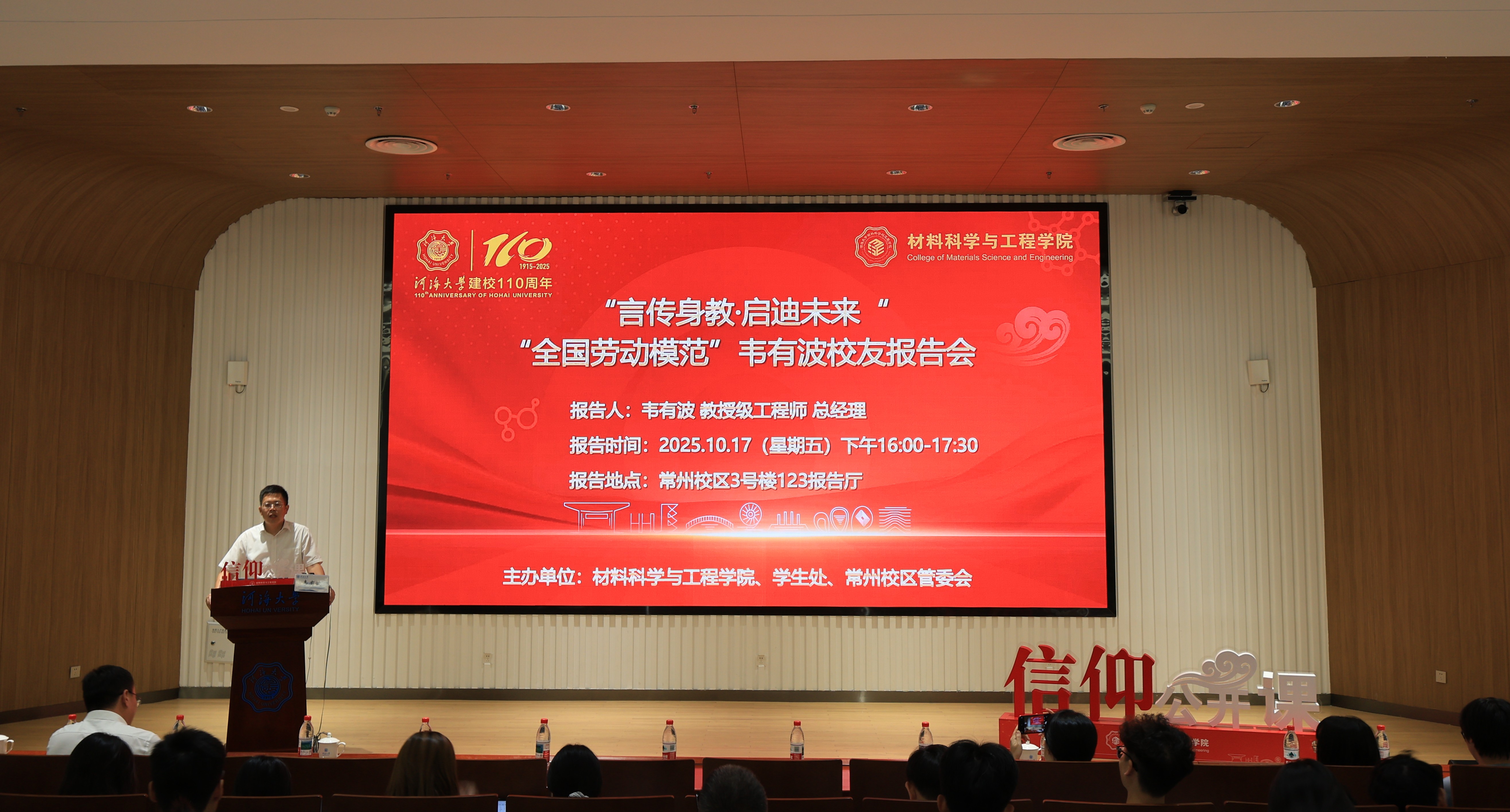为使青年学子坚定将青春华章写在祖国大地上的选择,汲取校友榜样的奋斗力量,10月17日下午,Bwin官网与常州校区管委会联合举办“言传身教·启迪未来”——“全国劳动模范”韦有波校友报告会暨信仰公开课,2025年“全国劳动模范”称号获得者、我校2005届无机非金属材料工程专业校友韦有波应邀作题为《生成未来,做最好的自己》的分享报告。